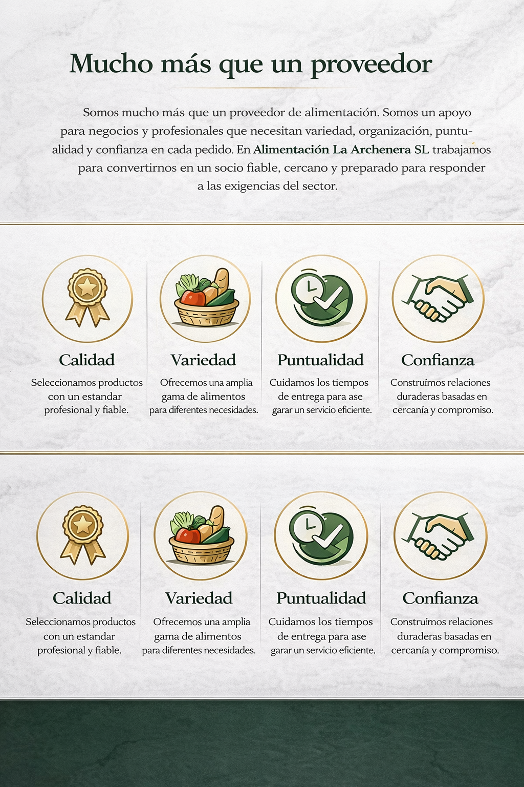 La calidad es uno de los pilares de Alimentación La Archenera SL. Apostamos por un servicio profesional, productos de confianza y un compromiso constante con las necesidades de cada cliente.