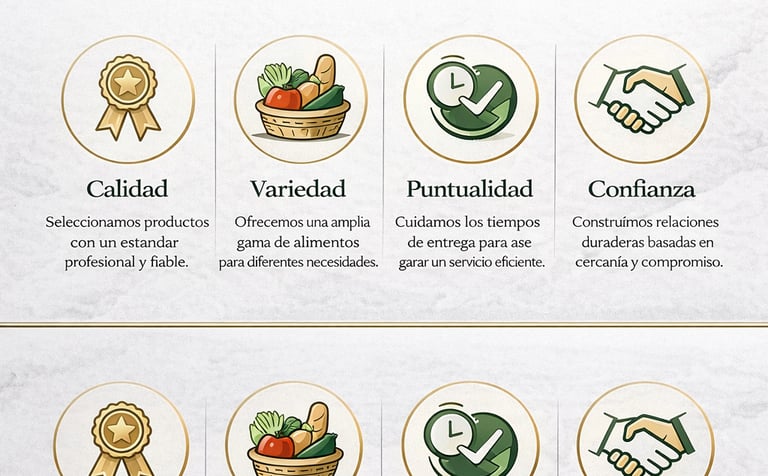 Apostamos por la calidad, la puntualidad y la variedad como base de nuestro servicio. Queremos ser mucho más que un proveedor: buscamos convertirnos en un socio fiable para negocios que necesitan un suministro constante, una atención profesional y soluciones ágiles dentro del sector alimentario.